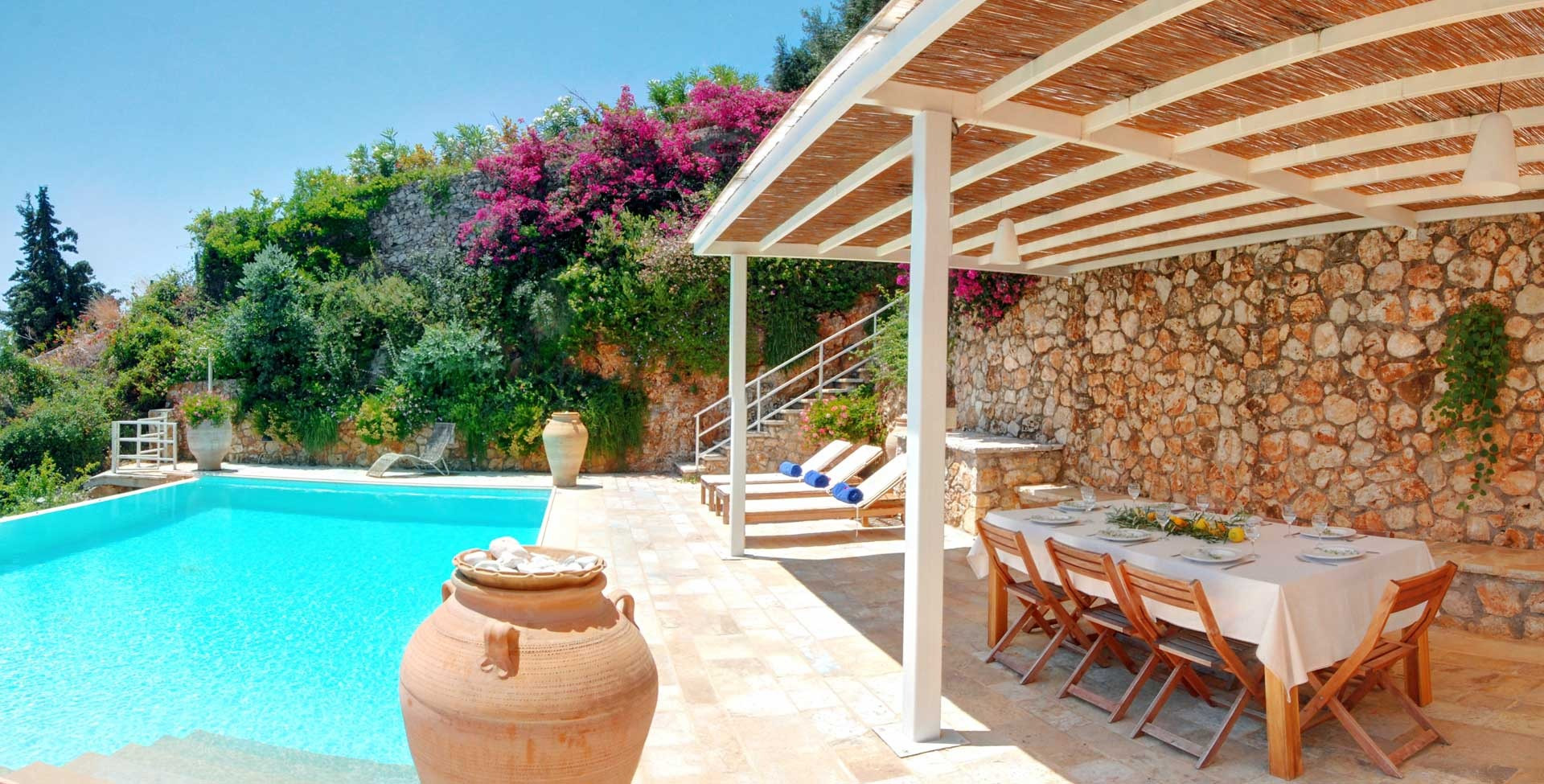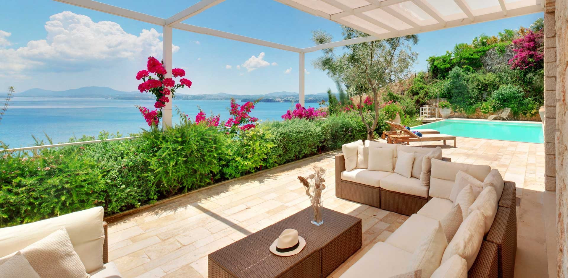 As you explore the outdoor areas, you'll be captivated by the stunning panorama of this hillside villa. You'll have your own private infinity pool with a jacuzzi, perfect for taking a refreshing dip. The spacious terrace is perfect for soaking up the sun and enjoying the picturesque views of the sea, mountains, and garden during the day. In the evening, you are tempted to share special moments with friends or family feeling the Ionian breeze. You can also make the most of a large covered dining area, ideal for outdoor meals.